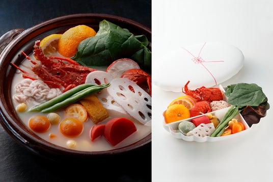 京のひめ苞 冬至鍋一年で夜が最も長くなる冬至は、「陰が極まり陽へ転ずる」節目の日。和久傳では、白味噌だしに柚子を浮かべ、南瓜や蓮根など“運(ん)”のつく縁起よい食材を盛り込んだ祝い鍋をご用意しています。冬至らしく柚子湯に見立てたおだしに、伊勢海老や雲子を加えた冬のごちそうです。