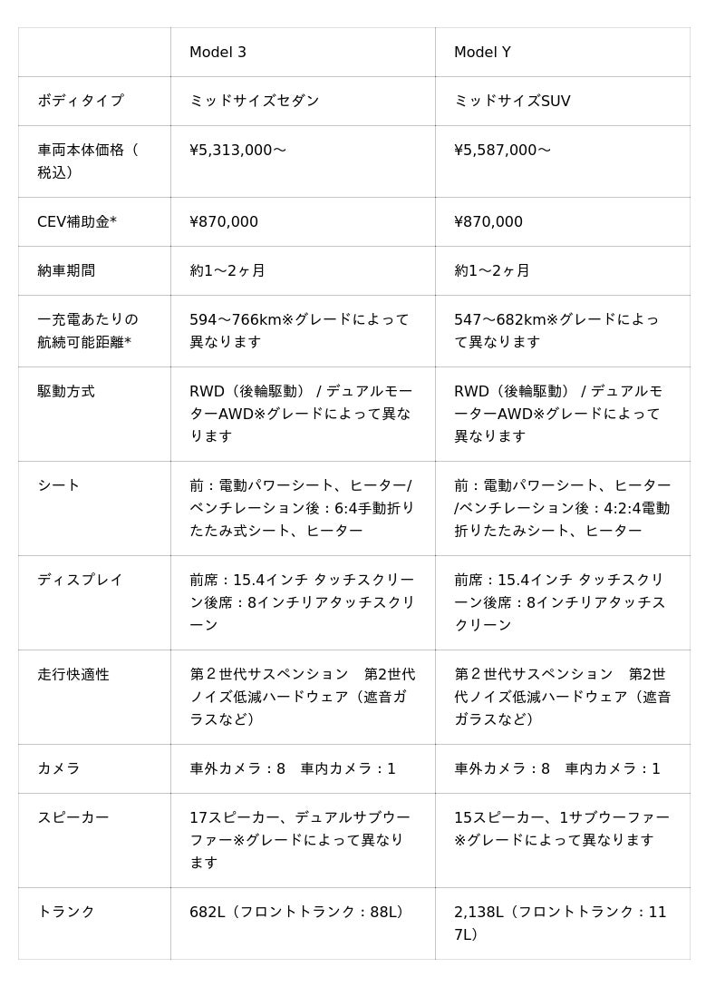 ※Model YまたはModel 3の新車を購入すると、国のCEV補助金が適用されます。また、各自治体独自に補助金を設定している場合があります。 詳しくはお住いの地方自治体ホームページをご確認ください。補助金の申請条件、および予算額の最新情報については事前にご確認ください。※一充電走行距離は、WLTCモード(国土交通省審査値)です。また、実際の航続距離は速度、気象条件、高度変化といった要素によって異なります。