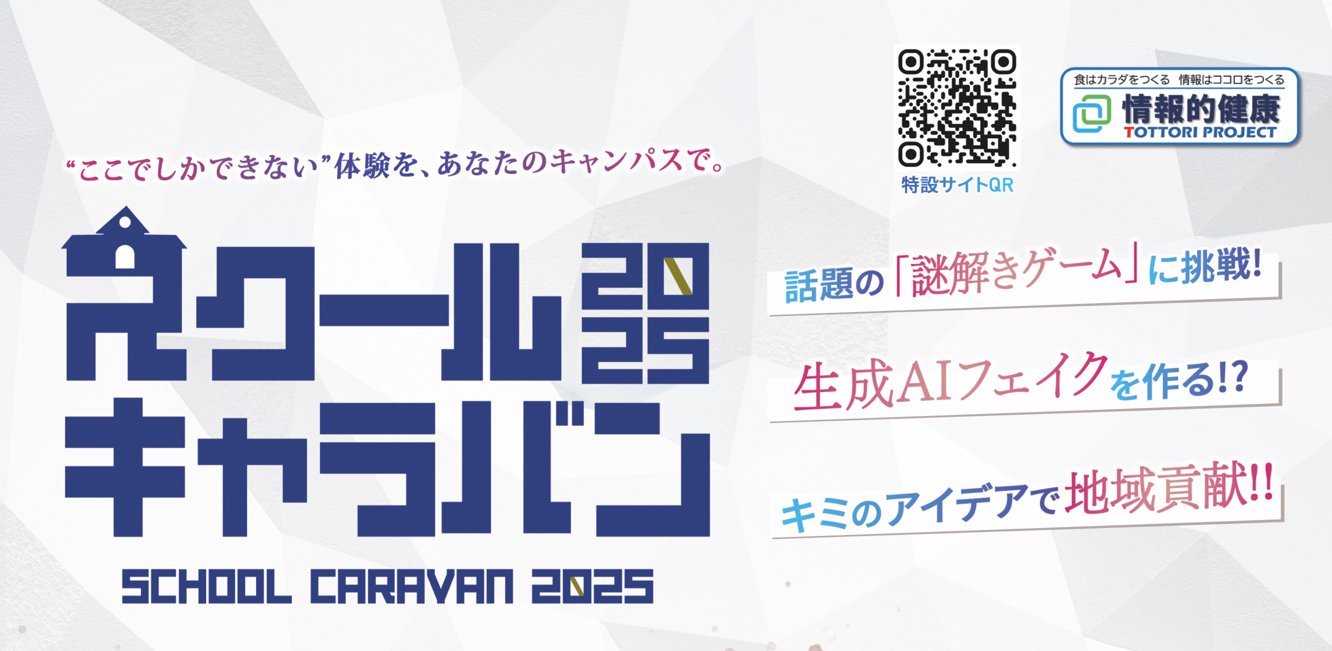 今年度、鳥取県では情報リテラシーの重要性を「食」に例えて伝える「情報的健康とっとりプロジェクト」を推進しています。その中心的な活動として、「スクールキャラバン」を実施し、鳥取大学をはじめ県内 11校の中学・高校・大学等で、慶應義塾大学の学生が手がけるスタートアップ企業「Classroom Adventure」の皆様と協力し、若者向けの啓発活動を展開しています。スクールキャラバンに参加した学生からは、 「フェイクが溢れる理由がわかった」「信憑性の高いサイトで再度その情報について調べ直したい」といった声があり、情報を見極める意識を高めていただけました。