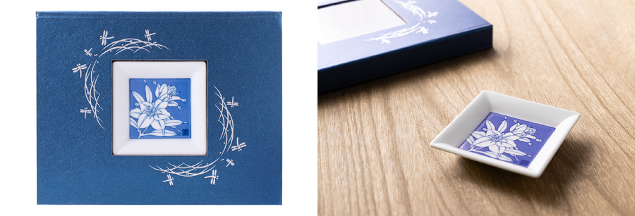 - 弔電「伊万里焼 瑠璃(るり)」深みのある青色に、白の繊細なラインで装飾された台紙と、伊万里焼の角皿を添えました。小皿は、鮮やかな青色を基調とし、中央には白い百合の花が描かれています。伝統的な和の美しさと上品さが感じられるデザインで、見る度に心慰められる佇まいです。