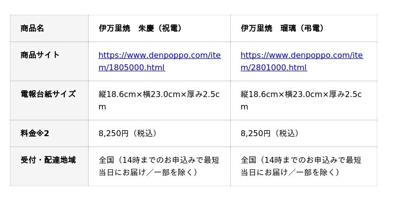 アルティウスリンク株式会社(所在地:東京都渋谷区、代表取締役社長:那谷 雅敏、以下 アルティウスリンク)が提供する、KDDIグループの電報サービス「でんぽっぽ」※1(以下でんぽっぽ)から、伊万里焼付き電報2種を2025年11月10日(月)より販売開始いたします。