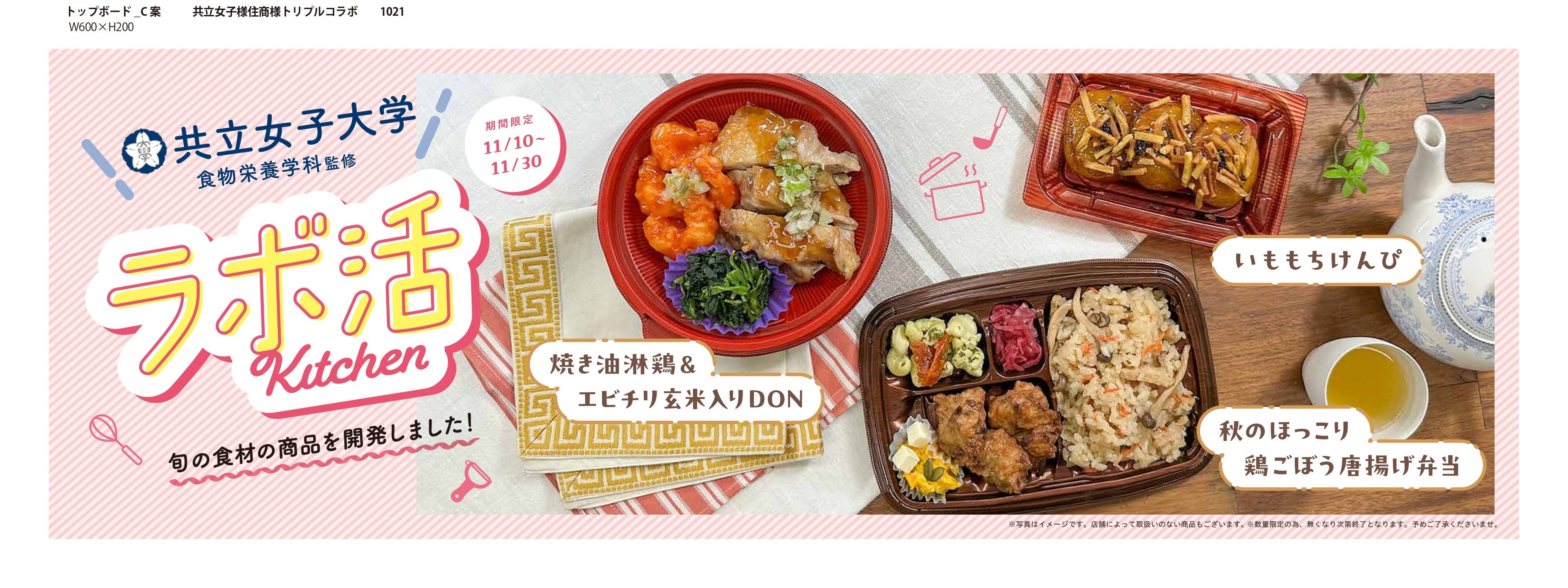 株式会社トライアルホールディングス(本社:福岡県福岡市、代表取締役:永田 洋幸)傘下の株式会社西友(本社:東京都武蔵野市、代表取締役社長:楢木野 仁司 以下「西友」)は、共立女子大学・共立女子短期大学(東京都千代田区 学長:佐藤 雄一、以下:共立女子大学)と、住商フーズ株式会社(代表取締役社長:岡本 誠地 本社:東京都千代田区、以下:住商フーズ)と共同開発した学生考案の惣菜3商品を、「ラボ活 Kitchen」シリーズとして2025年11月10日(月)から11月30日(日)の期間、関東の西友約110店舗※1にて順次販売いたします。