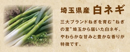 埼玉県は白ネギの生産が盛んで、県内で生産される野菜の中でも最も作付面積が多い野菜のひとつです。中でも「深谷ネギ」「越谷ネギ」「吉川ネギ」は“埼玉県三大ネギ”として知られ、やわらかな甘みと香ばしい風味が特徴です。今回の『白ネギのネギベエ』には、これらをはじめとする埼玉県産白ネギをたっぷり使用しています。
