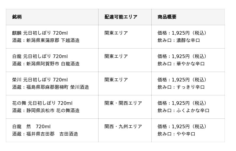 予約販売開始から今回で21年目となる2026年の“元日初しぼり”では麒麟(新潟県)、白龍(新潟県)、花の舞(静岡県)、榮川(福島県)、白龍 然(福井県)の5つの酒蔵でしぼりあげ、瓶詰めされた生酒をお客様にお届けします。1本からのご注文はもちろんのこと、4つの酒蔵の日本酒をお楽しみいただけることで、毎年ご好評いただいている飲み比べセットも販売いたします。