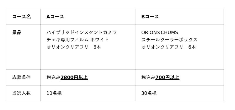 今回の「愉快爽快クリアフリー!キャンペーン」は、沖縄の行楽シーズンをより愉快に、爽快にお楽しみいただけるよう、Aコースでは「ハイブリッドインスタントカメラとオリオン クリアフリー6本」、Bコースでは「CHUMSコラボ スチールクーラーボックスとオリオン クリアフリー6本」など、外でも家でも楽しめるアイテムをご用意しました。さらに、はずれた方から抽選で60名様にえらべるPay(500円分)をプレゼントいたします。