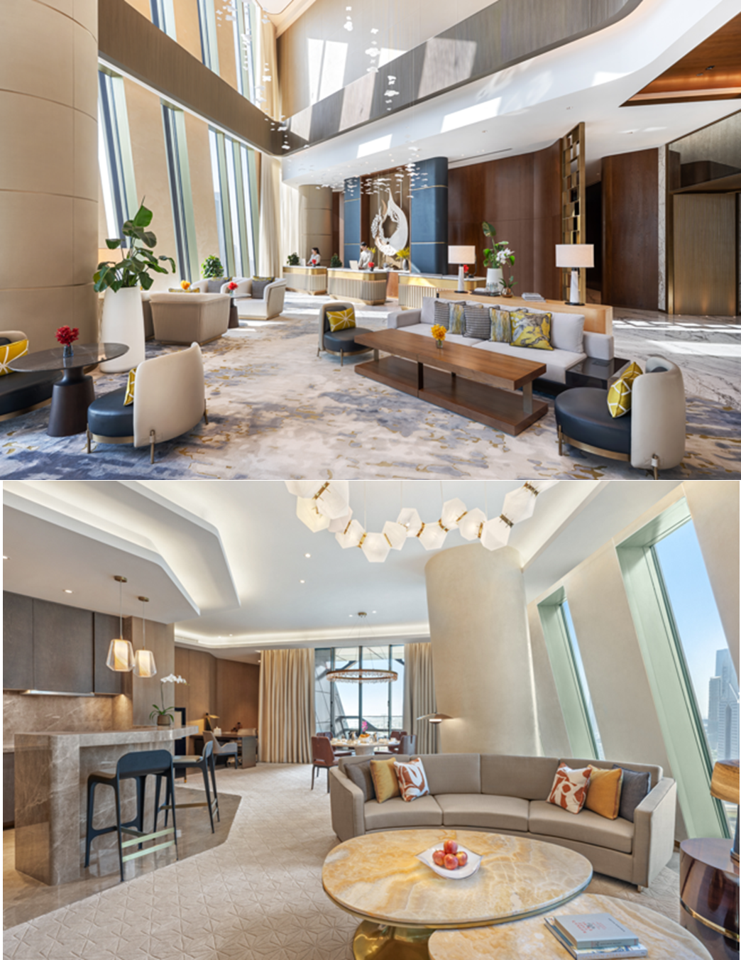 館内には、計259室の洗練された客室とスイート、224戸のレジデンス施設、10軒のレストラン&バーを擁し、ビルの最上階にはVIPのプライベート到着にも対応するヘリパッドも備えています。ワスル・ホスピタリティ社とのパートナーシップのもと誕生した当ホテルは、ドバイにおける現代的ラグジュアリーの新たな基準を打ち立てるような施設となっております。