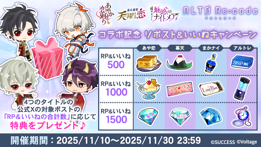 対象ポストの「リポスト・いいねの合計数」に応じて、「あやかし恋廻り」、「幕末維新 天翔ける恋」、「魔界王子と魅惑のナイトメア」、「アルトレコード」のゲーム内アイテムをプレゼントいたします。