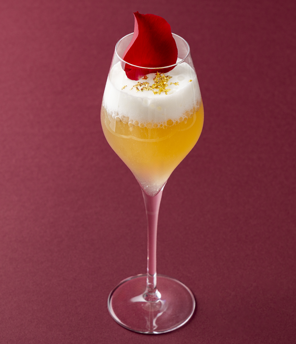 バラ香るスパークリングスパークリングワインに薔薇のエスプーマをトッピングしたカクテル。ご希望によりノンアルコールへの変更可能。