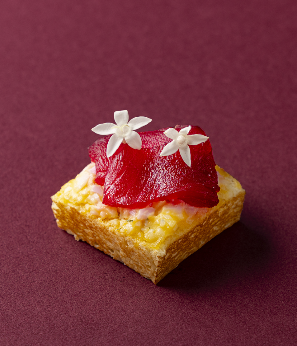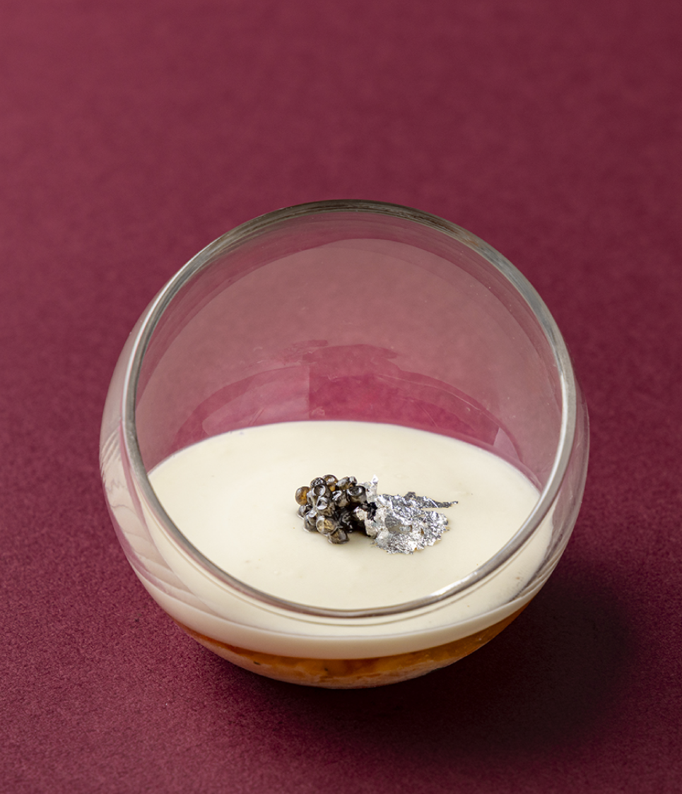 蟹と根セロリのブルーテ キャビア添え蟹のタルタルに、ビーフコンソメのゼリーと根セロリのクリームソースを重ねて、キャビアと銀箔をトッピング。蟹とコンソメの豊かな風味に、根セロリの爽やかなアクセントが効いた奥行きのある味わいに。
