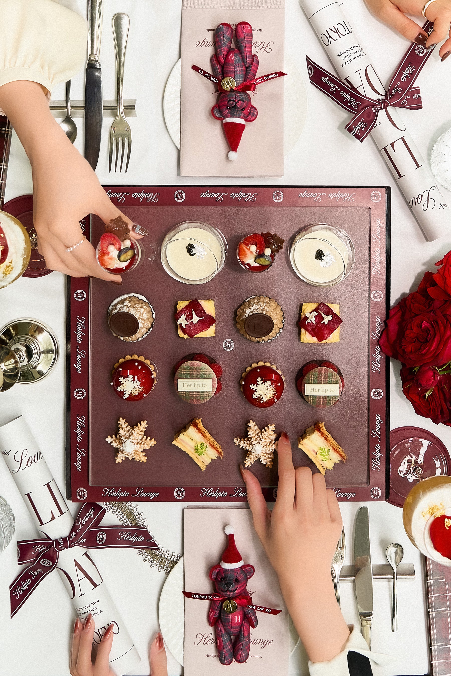 さらに、よりコラボレーションアフタヌーンティーの世界観をお楽しみいただくため、テーマに合わせて特別にデザインしたHer lip toオリジナルのテーブルセットのほか、人気のコンラッド・ベア付きプランには、タータンチェック柄にドレスアップした限定ベアが登場。ホリデーの特別感に満ちたひとときをお過ごしください。