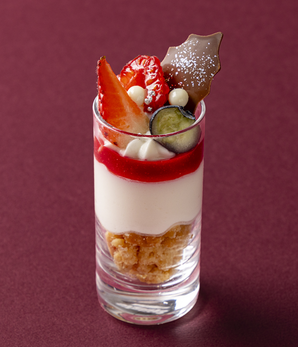 ラズベリーとフロマージュブランのトライフルザクザクした食感のクッキー生地に、ほんのり酸味を効かせたフロマージュブランと甘酸っぱいラズベリーソースを重ねたことで、味わいの濃淡や食感の変化をお楽しみいただけます。色鮮やかなフレッシュベリーとひいらぎを模ったミルクチョコレートを飾り、クリスマスの装いに。