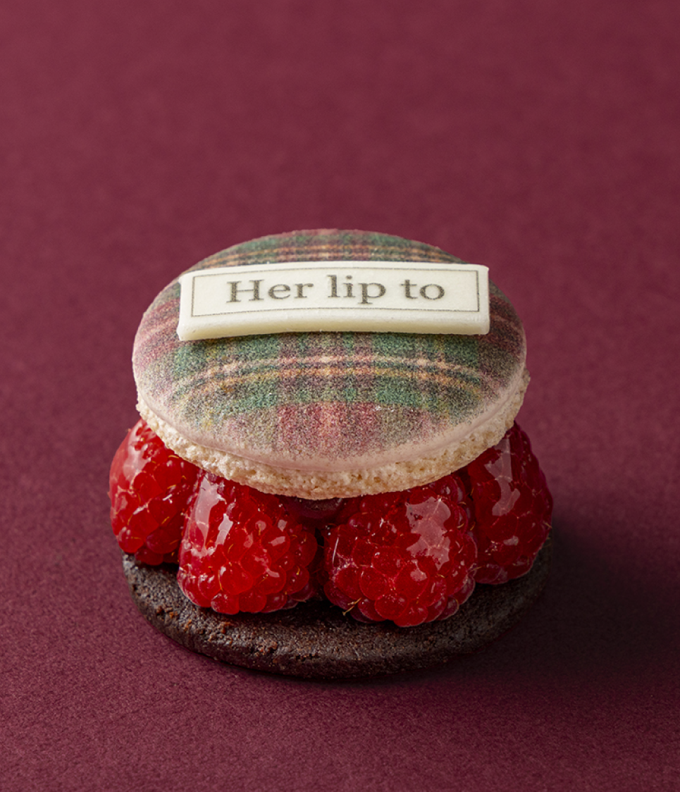 チョコレートとラズベリーのマカロンタータンチェック柄のマカロンと真っ赤なラズベリーをまとい、上品な魅力を詰め込んだスイーツ。濃厚なガナッシュチョコレートの上にキャラメリゼしたピーカンナッツを載せ、側面にラズベリーをあしらって瑞々しさをプラス。土台にはビターチョコレートのクッキーを使用することで、全体の味わいを引き締めました。