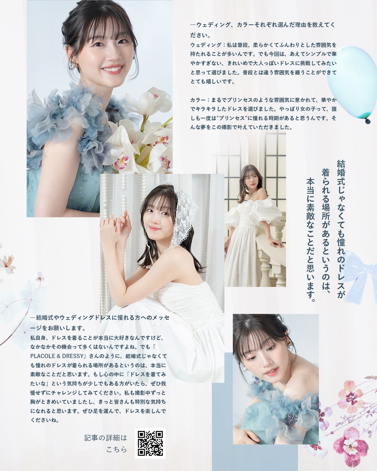 私自身、ドレスを着ることが本当に大好きなんですけど、なかなかその機会って多くはないんですよね。でも「PLACOLE & DRESSY」さんのように、結婚式じゃなくても憧れのドレスが着られる場所があるというのは、本当に素敵なことだと思います。もし心の中に「ドレスを着てみたいな」という気持ちが少しでもある方がいたら、ぜひ我慢せずにチャレンジしてみてください。私も撮影中ずっと胸がときめいていましたし、きっと皆さんも特別な気持ちになれると思います。ぜひ足を運んで、ドレスを楽しんでくださいね。(インタビューより抜粋)