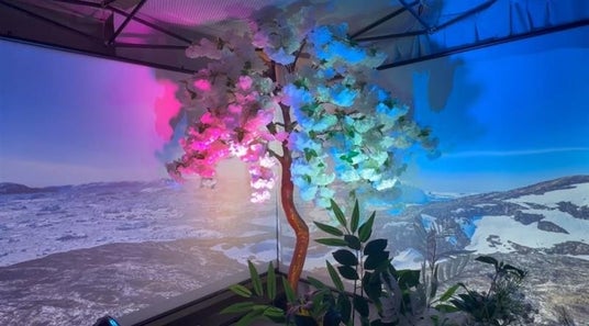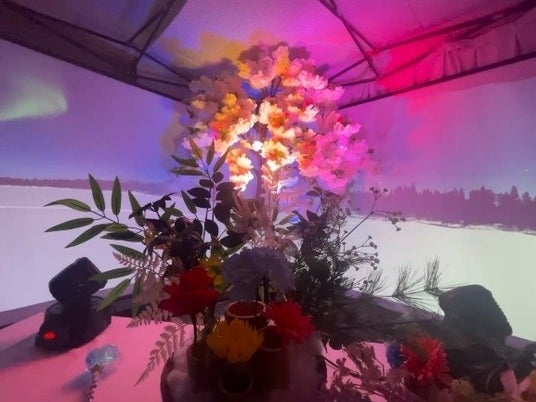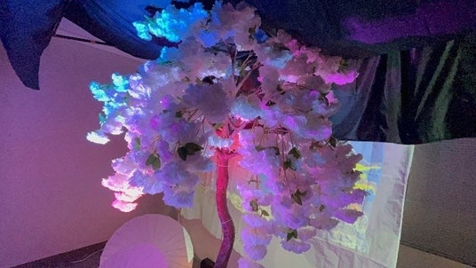 展示作品は2XXX年を想定したものになります。量子コンピュータの使用が当たり前となった未来社会を舞台に、ピンクダイヤモンドの光特性を活かした体験型アート作品に仕上げました。そして、"光×アート×高専"で遊びの中に学びがある空間を創りあげました。作品では、来場者に量子コンピュータの素材であるNVピンクダイヤモンドが隠れている樹に対して青色の光を照射してもらい、未来の素材を探すゲームを体験してもらいました。なお、光を操る方法には、米子高専生がプログラミングしたジャイロ型のムービングヘッドを使いました。またNVピンクダイヤモンドは国立研究開発法人物質・材料研究機構/株式会社Diancyの高野義彦博士により提供されたものを使用しました。