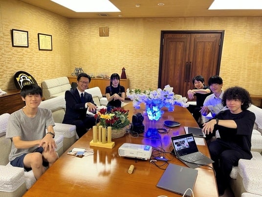 2025年大阪・関西万博での学生の活躍を報告するため、令和7年10月2日(木)に伊木隆司米子市長を表敬訪問しました。訪問の際には、クラゲ館に展示した光アートの作品の一部をデモ機として持ち込み、伊木市長に体験をして頂きました。伊木市長からは「創造性と技術力が融合した、未来社会を支える要素の込もった素晴らしい内容です」とお褒めの言葉を頂きました。