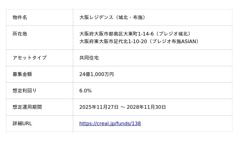 クリアル株式会社(本社:東京都港区、代表取締役社長 執行役員 CEO:横田 大造、以下「当社」)は、不動産ファンドオンラインマーケット「CREAL(クリアル)」で2025年10月29日(水)20時より募集した、大阪府に所在するレジデンス2件を投資対象とするファンド(以下、「本ファンド」)への投資申込を、満額申込のため受付終了したことをお知らせします