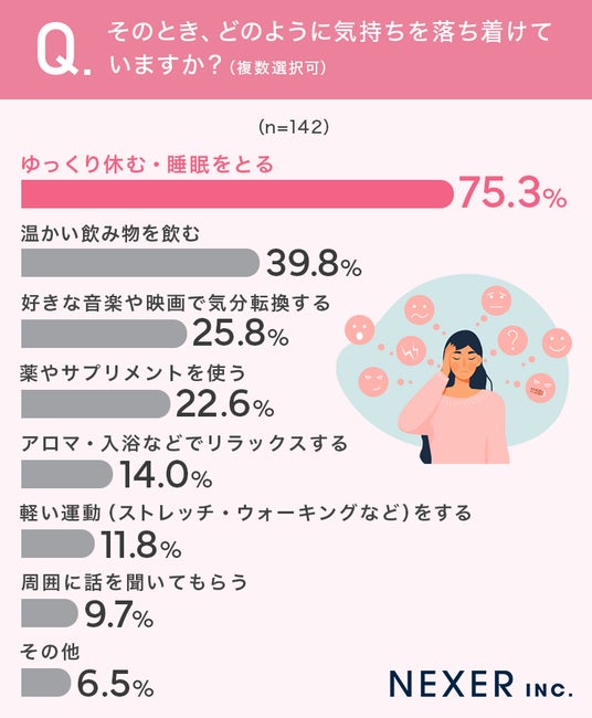 生理中の精神的な不調に対しては、「ゆっくり休む・睡眠をとる」が7割以上で、最も一般的な対処法であるようです。