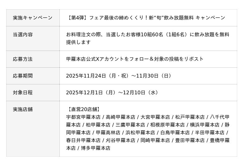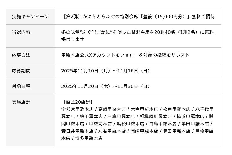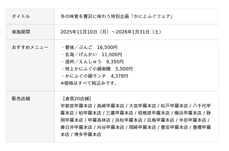 今回のキャンペーンは、全国の甲羅本店直営20店舗で実施しますので地域を問わず、どなたでも気軽にご参加いただける機会となっています。この冬限定の“旬の饗宴”を、ぜひ全国の甲羅本店でお楽しみ