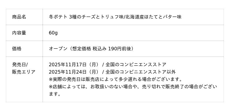 カルビー株式会社(本社:東京都千代田区、代表取締役社長兼CEO:江原 信)は、冬季限定の厚切りポテトチップス『冬ポテト 3種のチーズとトリュフ味/北海道産ほたてとバター味』を、2025年11月17日(月)から全国のコンビニエンスストア先行で期間限定発売します。コンビニエンスストア以外の店舗では、同年11月24日(月)から期間限定発売します(2026年2月下旬終売予定)。