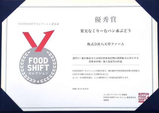 株式会社八天堂ファーム(本社:広島県三原市、代表取締役:林義之、以下、八天堂ファーム)が販売する商品「果実なくりーむパン 赤ぶどう」が、農林水産省が推進するニッポンフードシフト表彰事業「FOOD SHIFTセレクション(※)」において、全国の選定産品の中から優秀賞を受賞しました。