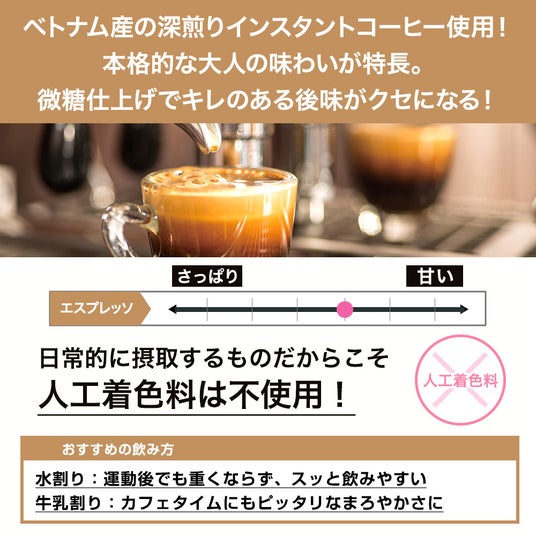 ベトナム産の深煎りインスタントコーヒーを使用した、エスプレッソ風味のプロテイン。
