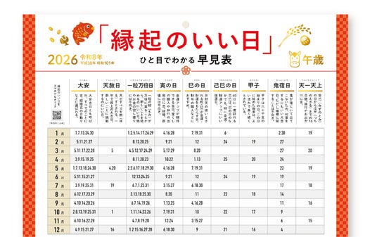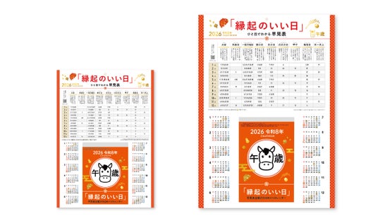 新日本カレンダー株式会社(本社:大阪市東成区、代表取締役社長:宮崎安弘)は、一粒万倍日や天赦日などの「縁起のいい日」を一年分一覧できる『縁起のいい日 台紙付き日めくり』を新発売しました。小サイズと大サイズの2タイプを、全国の文具店や雑貨店、ショッピングサイト等にて販売中です。