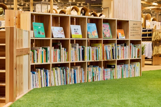 今回受賞した「無印良品 イオンモール橿原」のOpen MUJIは、世界最大の売り場面積を誇る店舗の中央に配置された「地域に開かれた憩いの広場」です。こどもだけでなく、家族や地域の人々が集い、思い思いの時間を過ごすことができるように、さまざまな「居場所」を設えました。ここで使われている床材や柱化粧材、家具、什器、玩具、楽器にいたるまで、この地域の資源である吉野杉や吉野檜をふんだんに使用することで、広場での遊びを通して、地域産材に包まれた空間を体験することができます。無垢材でつくられた本棚には、新品・中古品あわせて1万冊の児童書を配置しています。