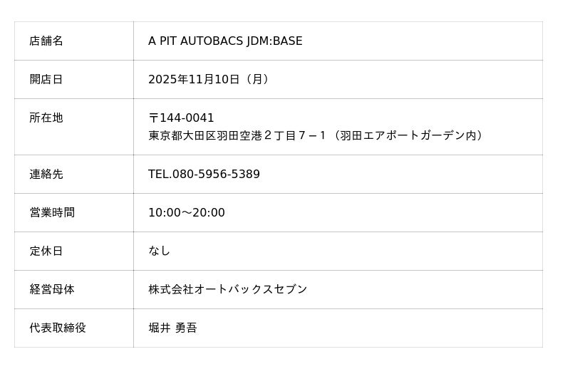 株式会社オートバックスセブン(代表取締役 社長:堀井勇吾)は、2025年11月10日(月)に羽田空港第3ターミナル直結の複合商業施設「羽田エアポートガーデン」内に「A PIT AUTOBACS JDM:BASE」を新規オープンいたします。