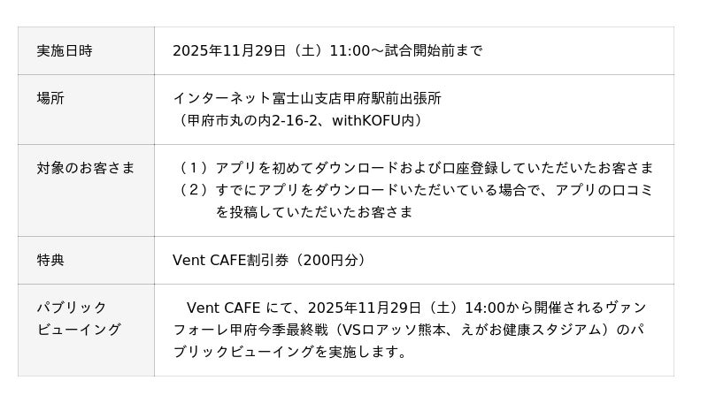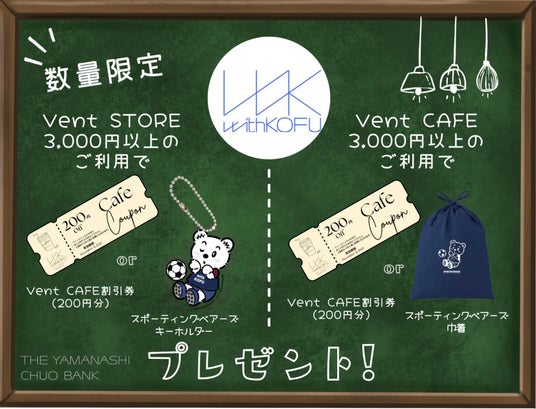 株式会社山梨中央銀行(頭取 古屋 賀章)と山梨中銀ディーシーカード株式会社(社長 萱沼 雄三)は、株式会社ヴァンフォーレ山梨スポーツクラブと連携し、新店舗「withKOFU」のオープンを記念したキャンペーンを実施します。