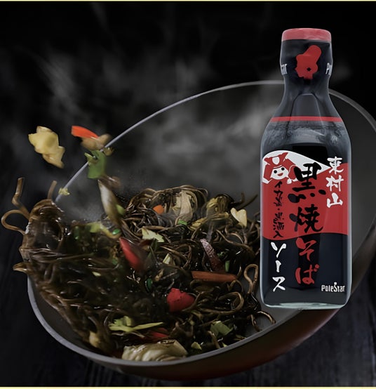 東村山を代表するご当地グルメ 『東村山黒焼そば』専用ソース! 「ポールスタア」特製のウスターソースに、 鹿児島の伝統調味料『黒酒』を加えた、 漆黒のソースです。コク深くまろやかでありながら、スパイスの香りがしっかりと際立ち、一度食べるとやみつきになる味わいに仕上げました。このソースこそ、東村山の誇る“黒焼そば食文化”の立役者。