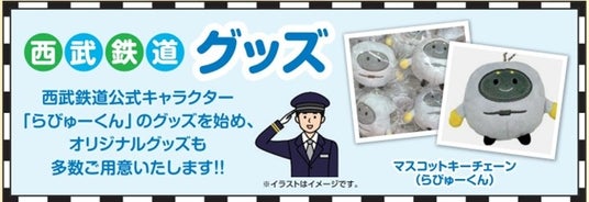 特急ラビュー5周年を記念して誕生した新キャラクター“らびゅーくん”グッズが登場。マスコットキーチェーン、フレークシール、Tシャツなど、お子さまから鉄道ファンまで楽しめるラインナップが勢揃いです。ほかにも西武鉄道のオリジナルグッズも多数ご用意いたします。