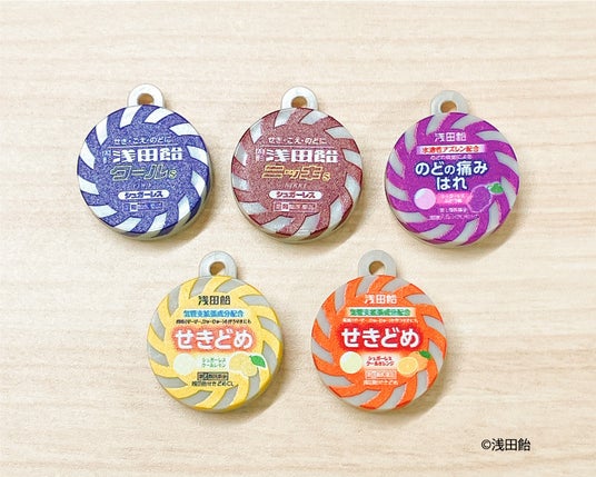 マスコットは全5種。固形浅田飴やせきどめなど、パッケージがそのままミニチュアサイズに!