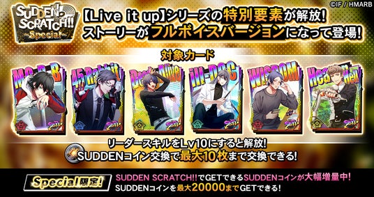 イベント期間中、KILLER SCRATCH!!をプレイするとライズ消費量に応じた確率でSUDDEN SCRATCH!!が発生します。SUDDEN SCRATCH!!をプレイすると、通常の報酬アイテムの他、限定アイテム「SUDDENコイン」を獲得することができます。「SUDDENコイン」を集めることで、「Ultimate Gコレチケット」や「A.R.B remix」楽曲などと交換することが可能です。さらに、Specialで【Live it up】シリーズの対象カードを最大10枚まで交換できるようになりました。【Live it up】シリーズのカードを10枚集めリーダースキルをLv10にすると、フルボイスバージョンのストーリーが解放されます。