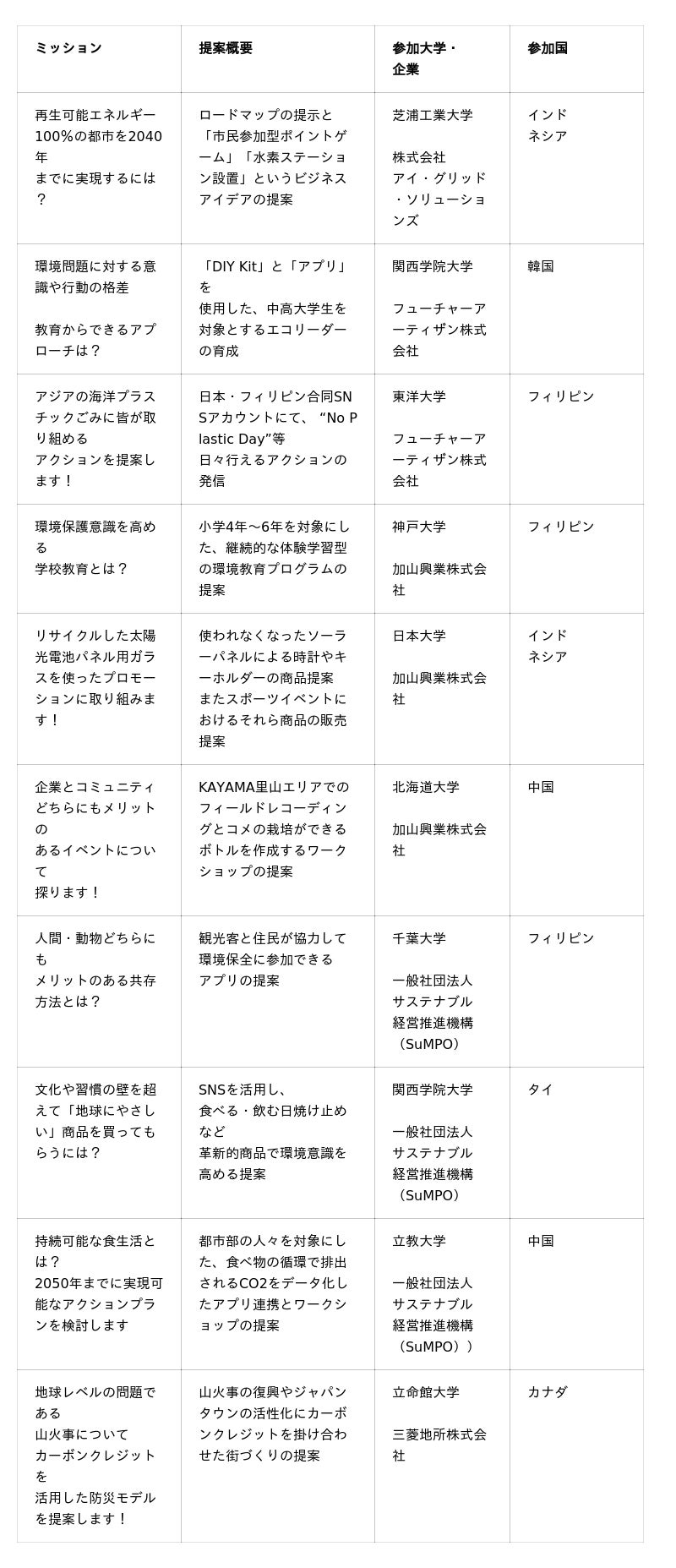 学生等と企業、海外と日本。多様な考え方・価値観を踏まえてソリューションを一つにまとめていく過程で、学生たちが、様々な専門知識をもった組織・人々と協力する力を得、今後の持続可能な社会を形づくる一助にならんことを弊社一同、願ってやみません。