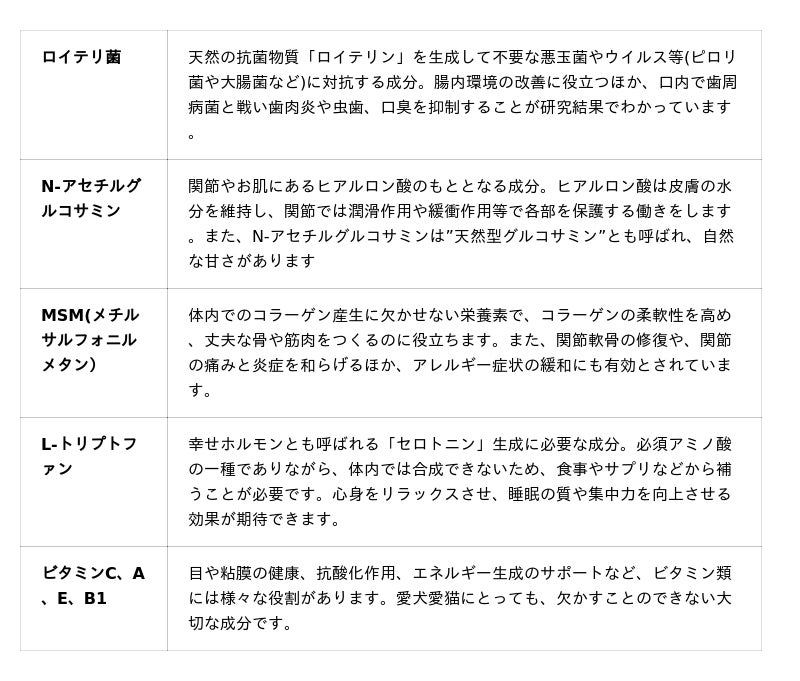 原材料名:デキストリン(国内製造)、鰹節パウダー、NMN(ニコチンアミドモノヌクレオチド)、乳酸菌凍結乾燥粉末(デキストリン、ロイテリ菌)、乳酸菌(殺菌)(EC-12)、N-アセチルグルコサミン、MSM、HPMC、L-シスチン、ビタミンC、L-トリプトファン、ナイアシン、ビタミンA、ビタミンE、ビタミンB1