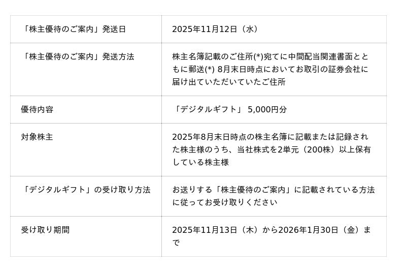 2025年8月末日時点の株主名簿に記載または記録されている株主様のうち、当社株式を2単元(200株)以上保有されている方を対象として、「デジタルギフト」の受け取り方法を記載した書面「株主優待のご案内」を2025年11月12日(水)に発送いたします。