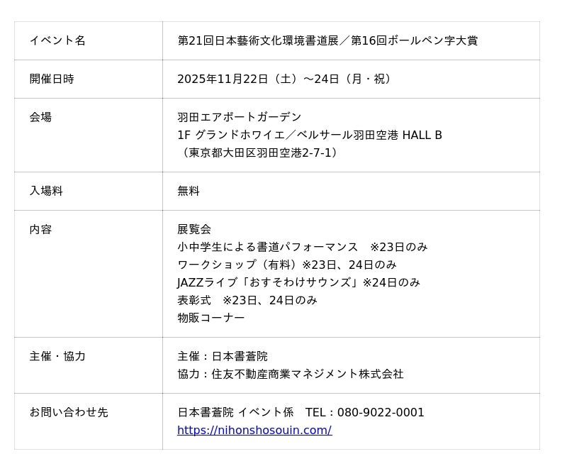 住友不動産商業マネジメント株式会社(本社:東京都新宿区、代表取締役社長:山本 直人)が運営する、羽田空港第3ターミナル直結の複合施設「羽田エアポートガーデン」(所在地:東京都大田区)では、2025年11月22日(土)~24日(月・祝)の3日間、「第21回日本藝術文化環境書道展/第16回ボールペン字大賞」を開催いたします。