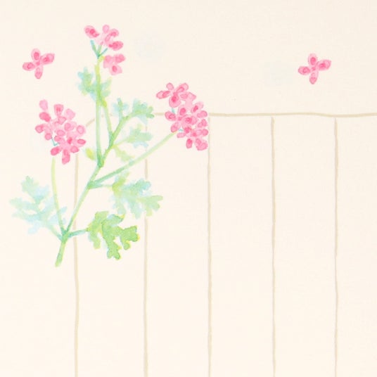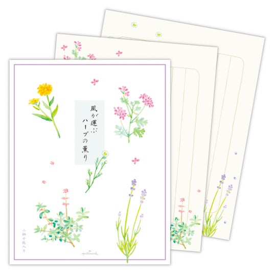 みずみずしいゼラニウム、輝くキンセンカ、優美なカモミール、穏やかなラベンダー、芳しいセージ。摘みたてのハーブの香りがそっと立ちのぼる場面をイメージしながら、水彩のやわらかなタッチで花々を描きました。