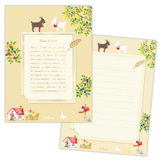 お手紙を書くシーンと親和性の高い童謡「やぎさんゆうびん」の世界観をテーマに、海外の絵本の装丁をイメージしてデザインしました。お手紙の左下がヤギにかじられたようになっているあしらいがチャームポイントです。