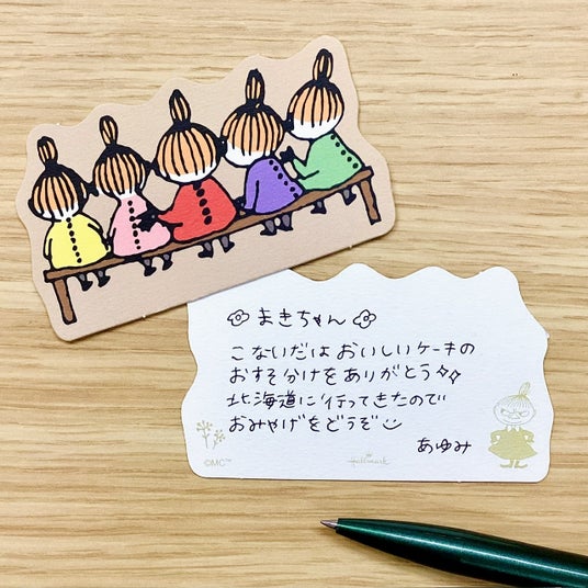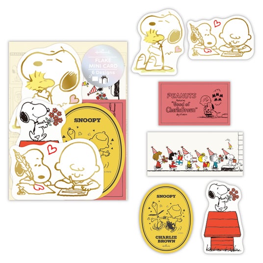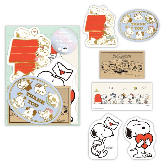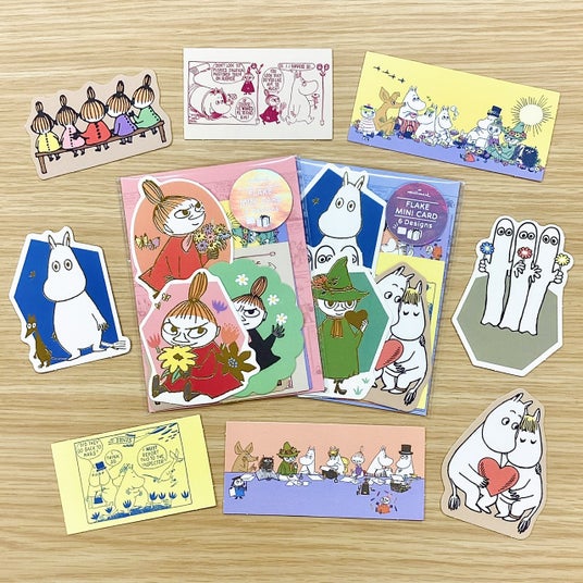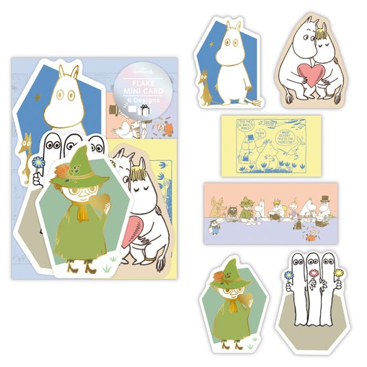 「フレークミニカード」は、すべて異なる絵柄と形で構成されたフレークタイプのメッセージカードです。1パッケージに6柄6枚をセットし、キャラクターの魅力が際立つ大きめのダイカットデザインを中心に、Peanuts(TM)とムーミンの計4種を展開しました。