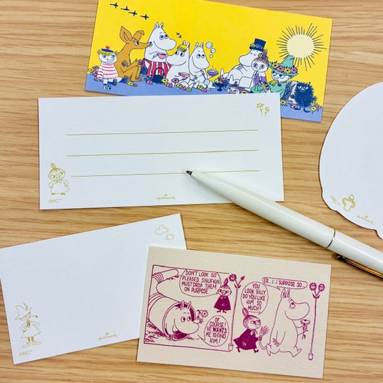 ムーミン一家やスナフキンなど、ムーミンのキャラクターたちが勢揃いしたセット。ハートを抱えるムーミンとスノークのおじょうさん、お花を持ったニョロニョロなど、ギフトシーンをイメージさせるアートを選びました。原作コミックスのコマをピックアップした特別感あるデザインも楽しめます。