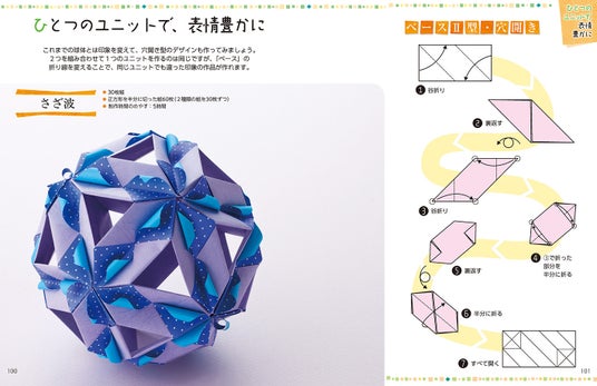 ひとつのユニットで表情豊かに!「ベース」の折り線を変えることで、同じユニットでも違う印象のくす玉を作ることができます。