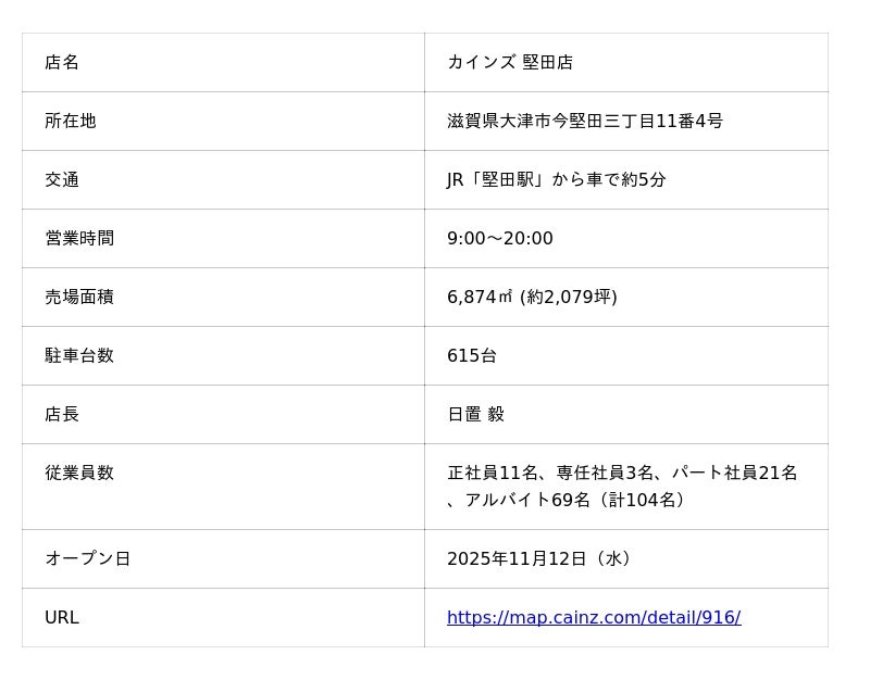 株式会社カインズ(本部:埼玉県本庄市、代表取締役社長 CEO:高家 正行)は、カインズ 堅田(かたた)店が2025年11月12日(水)に、滋賀県大津市にグランドオープンすることをお知らせします。