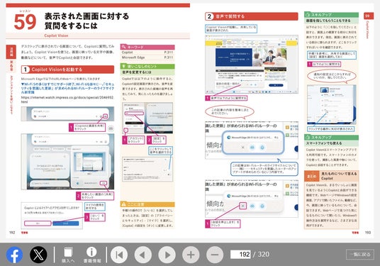 書籍内容の提供には、自社開発の「インプレスWebブックビューアー」を使用します。Web ブラウザーで紙面を閲覧できるので、場所や時間を選ばずにパソコンやスマートフォンなどから手軽に利用できます。また、SNS で書籍の情報を共有したり、書籍の購入や詳細を確認したりできる機能も備えています。