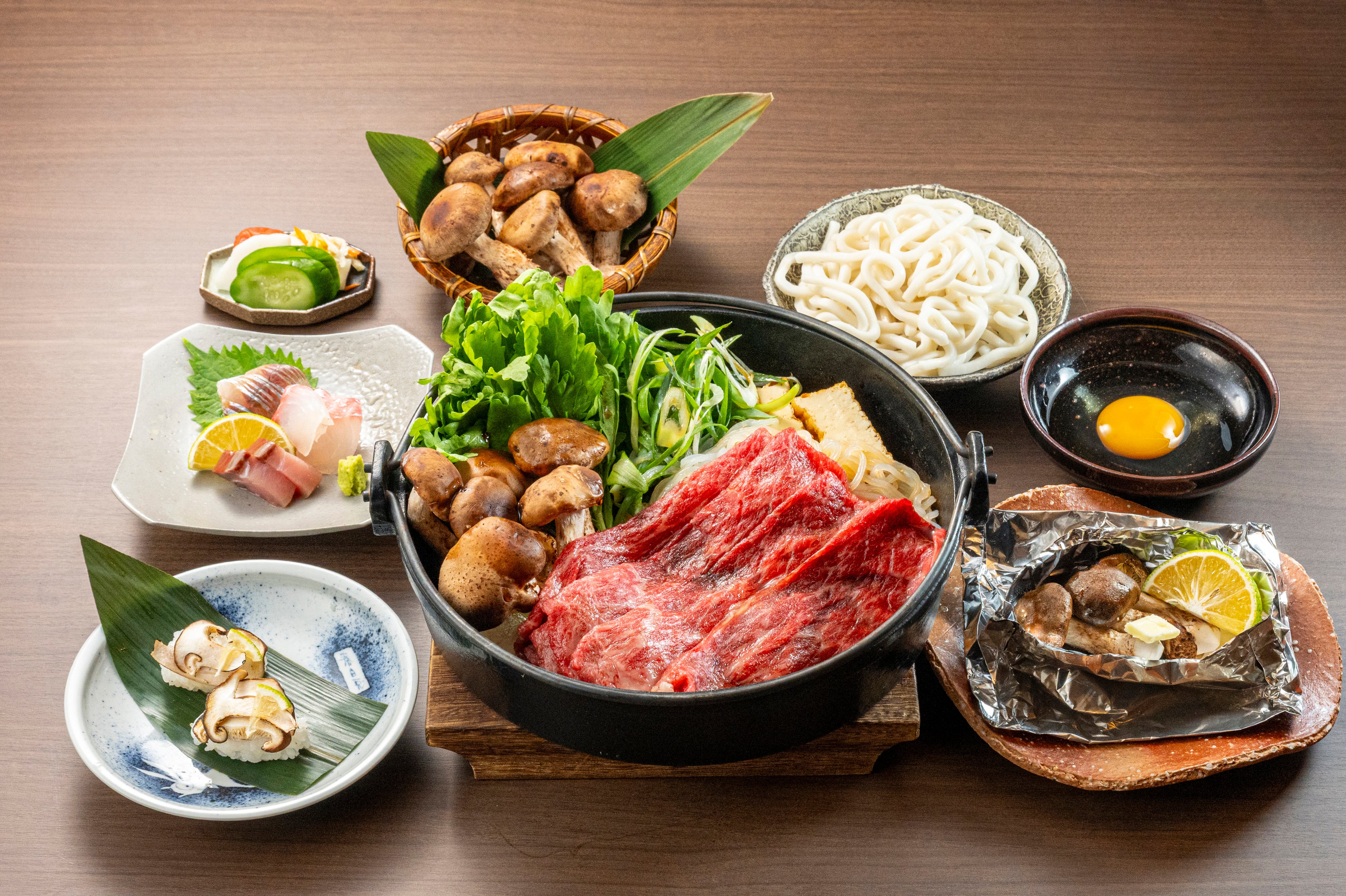 繊細な「松きのこ」の旨みが、お肉の甘みと見事に調和。使用するお肉は和牛のロースをご用意しました。上品な香りが食欲をそそる、贅沢なすき焼きです。