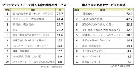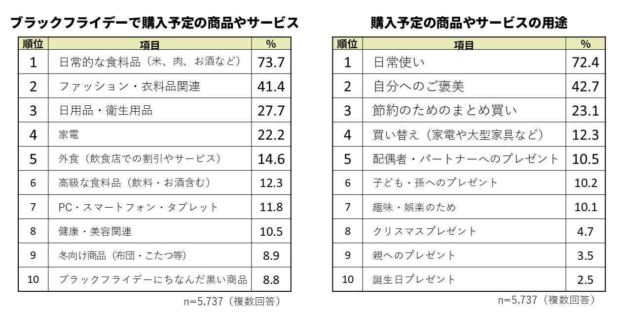 ブラックフライデーを生活費の節約手段として活用している人がいる一方で、ファッションや普段買えない食品、家電など、「自分へのご褒美」を購入する人も多いようです。