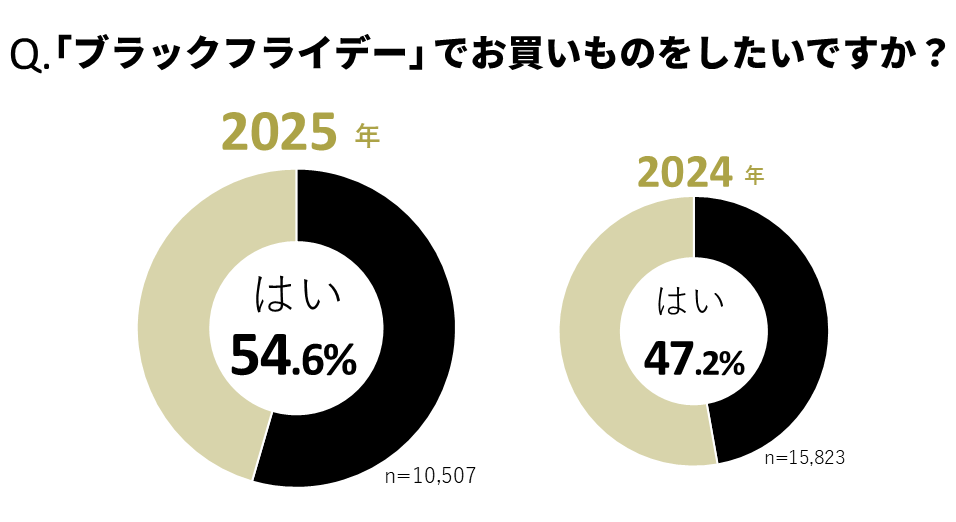 今年のブラックフライデーに買い物をしたいか意向を聞いたところ、半数以上(54.6%)の人が「買い物をしたい」と答えています。こちらは昨年から7.4ポイントアップしています。前年と比較して確実に増加傾向にあることがわかります。