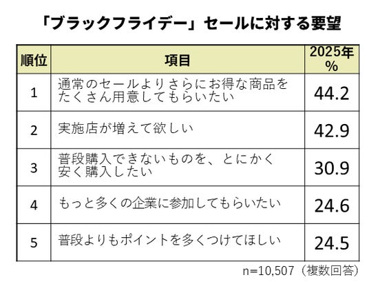 「ブラックフライデーセールに対する要望」も聞いてみたところ、「通常のセールよりさらにお得な商品をたくさん用意してもらいたい」(44.2%)が最も多い結果でした。