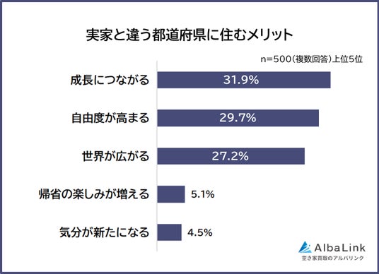 一方、「実家と違う都道府県に住むメリット」の1位は「成長につながる(31.9%)」で、30%以上の人から回答を得ました。2位「自由度が高まる(29.7%)」、3位「世界が広がる(27.2%)」という回答も多くなっています。