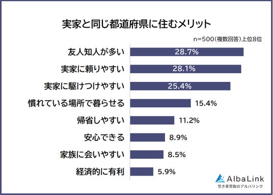 「実家と同じ都道府県に住むメリット」を聞いたところ、1位は「友人知人が多い(28.7%)」でした。僅差の2位は「実家に頼りやすい(28.1%)」、3位は「実家に駆けつけやすい(25.4%)」となっています。